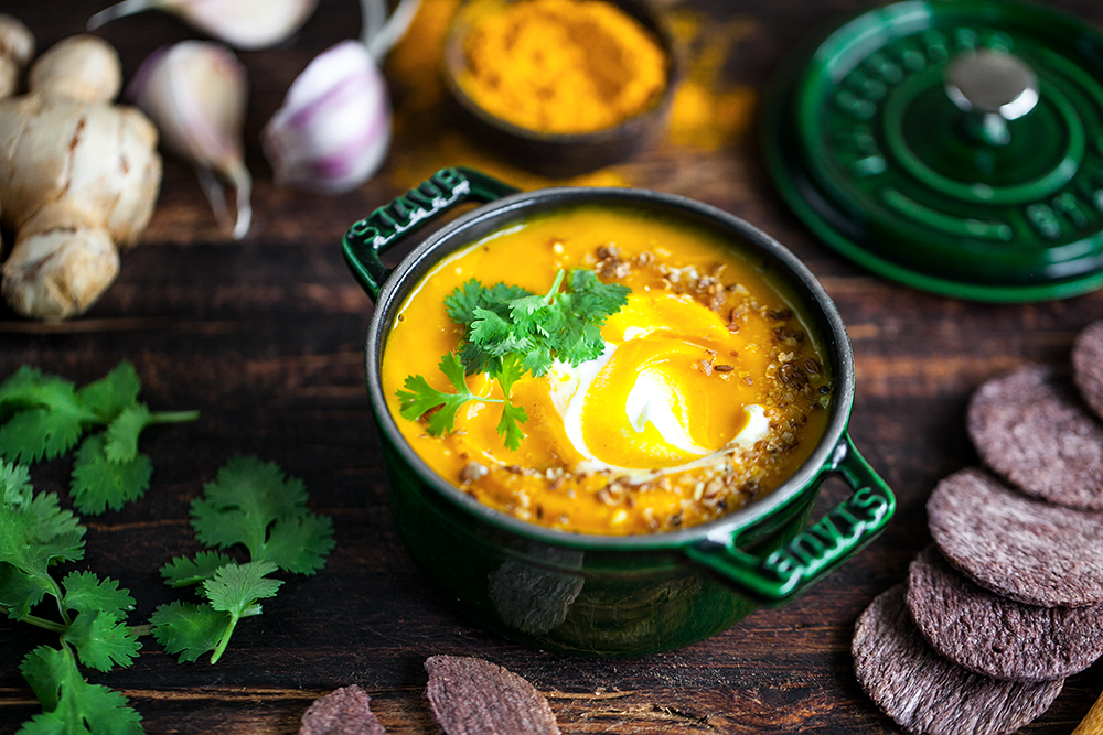 Warm up with healthy and delicious pumpkin soup.